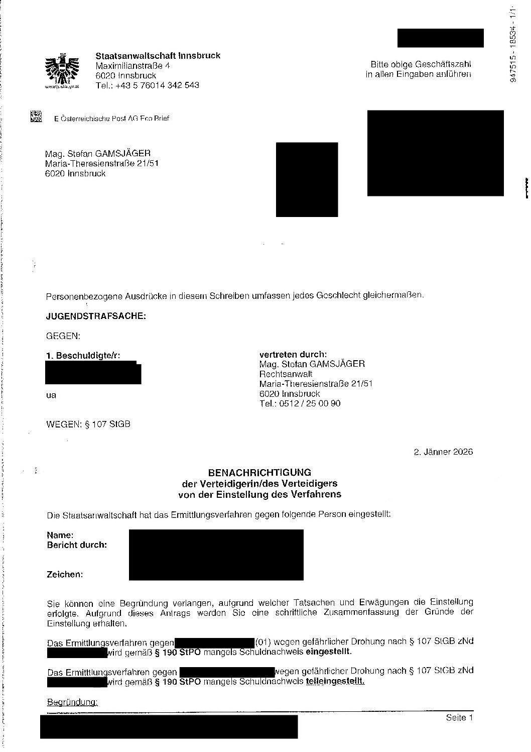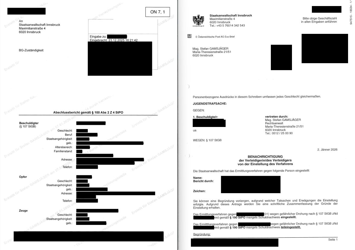 Durch das Einschreiten der Kanzlei sowie durch die strategisch kluge Ausübung des Aussageverweigerungsrechts und das fundierte Vorbringen juristischer Argumente konnte dargelegt werden, dass im vorliegenden Fall keine gefährliche Drohung vorliegt und somit der Straftatbestand nicht erfüllt ist.