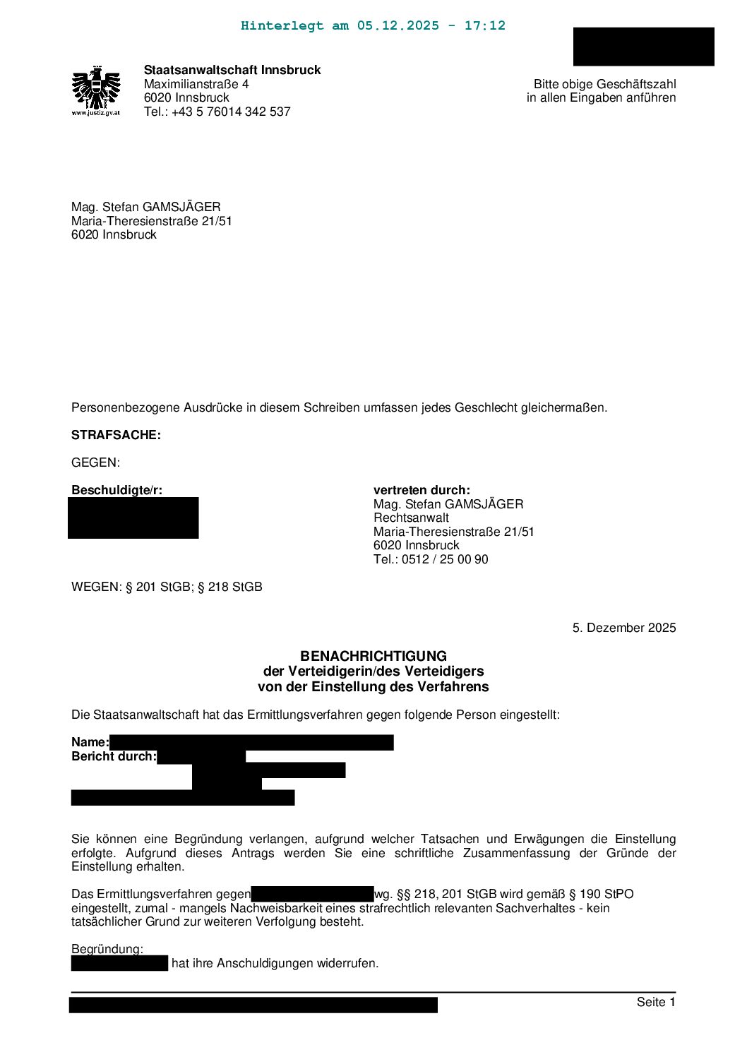 Von Beginn an wurde der Sachverhalt sorgfältig aufgearbeitet, Widersprüche analysiert und entlastende Umstände klar herausgearbeitet. Ein zentraler Wendepunkt im Verfahren war unter anderem die spätere Rücknahme der belastenden Aussage durch die mutmaßlich geschädigte Person. Dieser Umstand hatte erheblichen Einfluss auf die Beweiswürdigung und führte letztlich dazu, dass ein hinreichender Tatverdacht nicht mehr aufrechterhalten werden konnte.