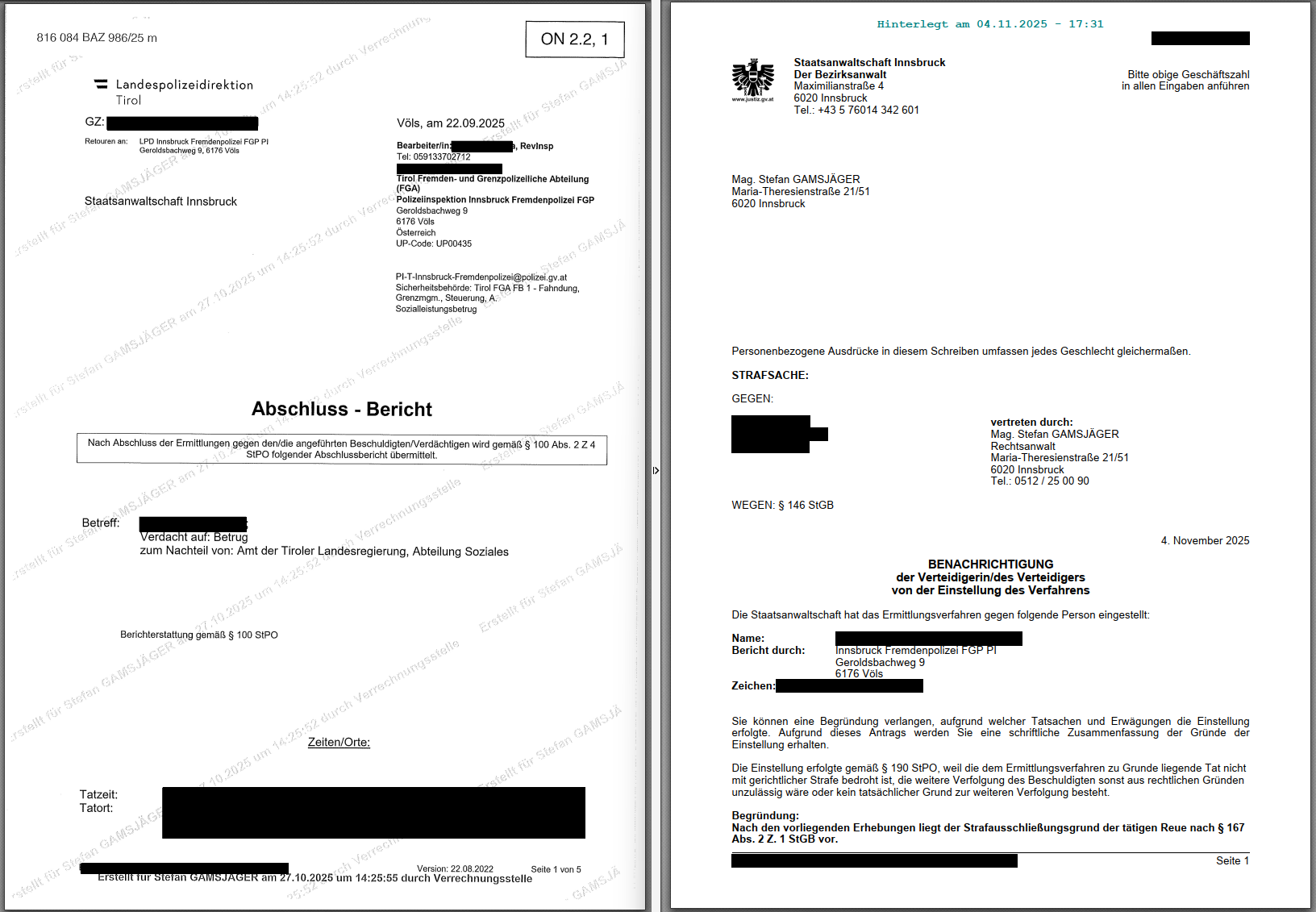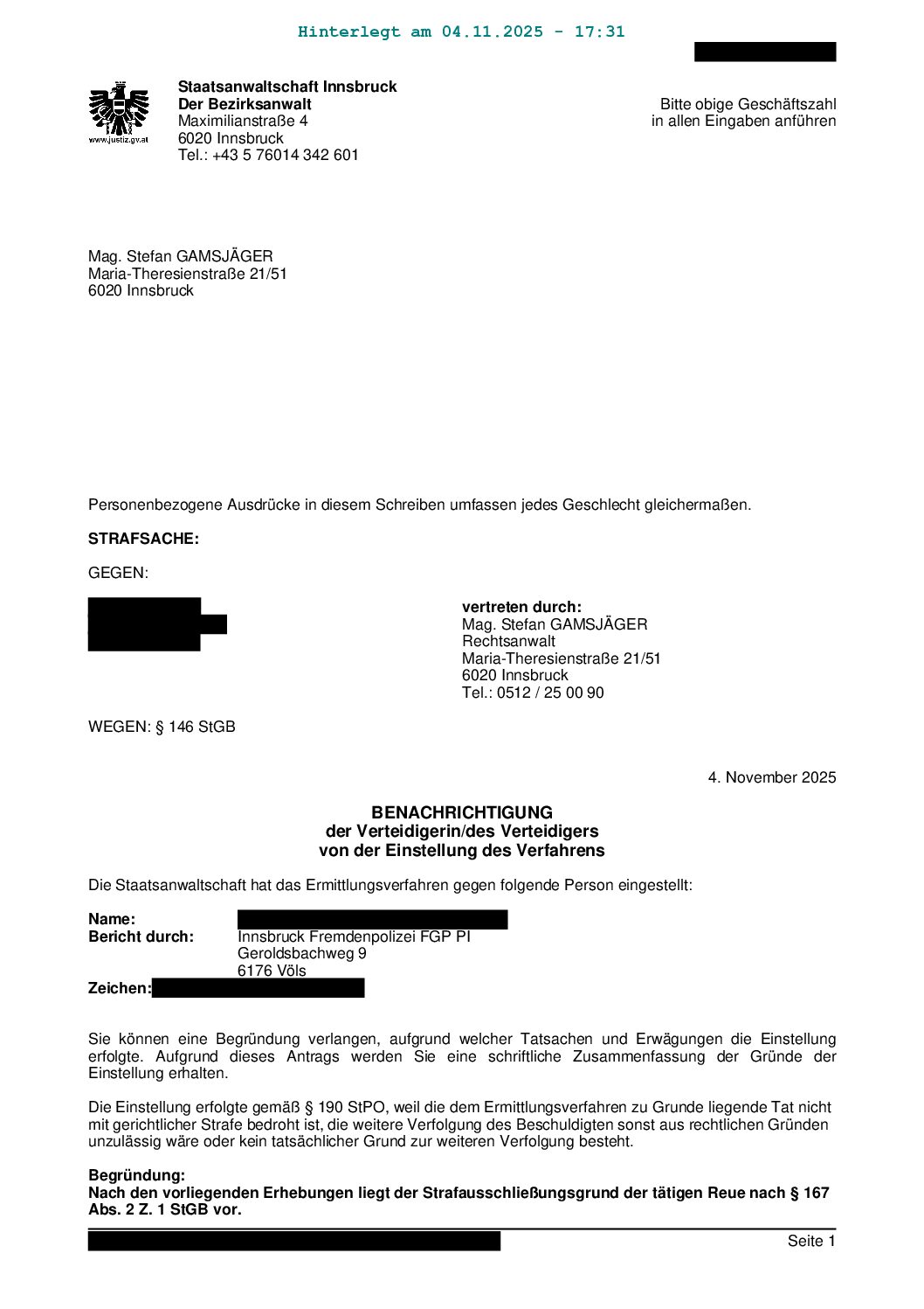 Durch unsere Stellungnahme und unser Einschreiten konnte die Unschuld unserer Mandantin bewiesen und somit die Einstellung des Verfahrens seitens der Staatsanwaltschaft Innsbruck erzielt werden.
